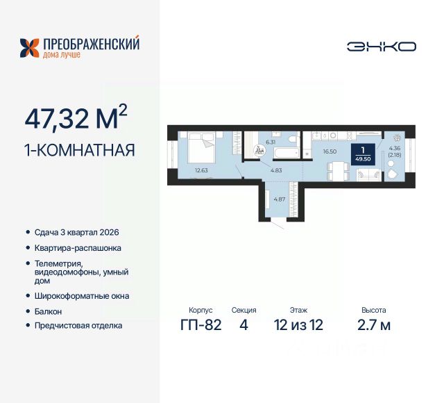 Однокомнатная квартира с предчистовой отделкой в ЖК "Преображенский" на 12 этаже. Общая площадь: 38.73 кв.м., жилая: 11.34 кв.м., площадь просторной кухни-столовой: 14.6 кв.м. Все окна выходят на одну сторону. В квартире одна лоджия, один совмещенный санузел. Высота потолков 2.7 м. Дом монолитный, многоподъездный, переменной этажности, от 8 до 12 этажей. Квартира находится в 4-й секции высотой 12 этажей в корпусе ГП-82. На этаже 6 квартир. В подъезде 1 пассажирский и 1 грузовой лифт. Окончание строительства - 3 квартал 2026 года. Оформление сделки по договору долевого участия. Квартал будет расположен в микрорайоне Славянский на пересечении улиц Мира и 70-летия Октября. Престижный район, собственный парк, вся необходимая для жизни, учёбы и работы инфраструктура — новая школа с бассейном и кванториумом, новый детский сад, поликлиника, спорткомплекс, магазины и др. Чтобы в квартирах было как можно больше свободного пространства, мы предусмотрели индивидуальные кладовые на цокольном этаже. Оставляйте коляски и сезонный спортинвентарь после прогулок здесь — удобно для вас и чисто для квартиры. В подземный паркинг можно спуститься на лифте прямо с квартирной площадки. #zSETBF