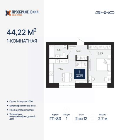 1-комн. квартира с предчистовой отделкой в ЖК "Преображенский" на 2 этаже. Общая площадь: 49.49 кв.м., жилая: 12.92 кв.м., площадь просторной кухни-столовой: 17.96 кв.м. Квартира - распашонка, без проходных комнат, окна выходят на paзные стороны дома. В квартире один балкон, один совмещенный санузел. Высота потолков 2.7 м. Дом монолитный, многоподъездный, переменной этажности, от 8 до 12 этажей. Квартира находится в 1-й секции высотой 12 этажей в корпусе ГП-83. На этаже 7 квартир. В подъезде 1 грузовой лифт. Начало строительства - 4 квартал 2023 года. Окончание строительства - 3 квартал 2026 года. Оформление сделки по договору долевого участия. Квартал будет расположен в микрорайоне Славянский на пересечении улиц Мира и 70-летия Октября. Престижный район, собственный парк, вся необходимая для жизни, учёбы и работы инфраструктура — новая школа с бассейном и кванториумом, новый детский сад, поликлиника, спорткомплекс, магазины и др. Чтобы в квартирах было как можно больше свободного пространства, мы предусмотрели индивидуальные кладовые на цокольном этаже. Оставляйте коляски и сезонный спортинвентарь после прогулок здесь — удобно для вас и чисто для квартиры. В подземный паркинг можно спуститься на лифте прямо с квартирной площадки. #Z3M6Zo Купить 1-комнатную квартиру на 2 этаже в Новом Уренгое.