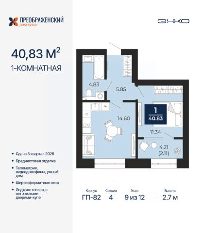 Однокомнатная квартира от застройщика с предчистовой отделкой в ЖК "Преображенский" на 9 этаже. Общая площадь: 40.83 кв.м., жилая: 11.34 кв.м., площадь просторной кухни-столовой: 14.6 кв.м. Все окна выходят на одну сторону. В квартире одна лоджия, один совмещенный санузел. Высота потолков 2.7 м. Дом монолитный, многоподъездный, переменной этажности, от 8 до 12 этажей. Квартира находится в 4-й секции высотой 12 этажей в корпусе ГП-82. На этаже 6 квартир. В подъезде 1 пассажирский и 1 грузовой лифт. Окончание строительства - 3 квартал 2026 года. Оформление сделки по договору долевого участия. Квартал будет расположен в микрорайоне Славянский на пересечении улиц Мира и 70-летия Октября. Престижный район, собственный парк, вся необходимая для жизни, учёбы и работы инфраструктура — новая школа с бассейном и кванториумом, новый детский сад, поликлиника, спорткомплекс, магазины и др. Чтобы в квартирах было как можно больше свободного пространства, мы предусмотрели индивидуальные кладовые на цокольном этаже. Оставляйте коляски и сезонный спортинвентарь после прогулок здесь — удобно для вас и чисто для квартиры. В подземный паркинг можно спуститься на лифте прямо с квартирной площадки. #ZwfzBd