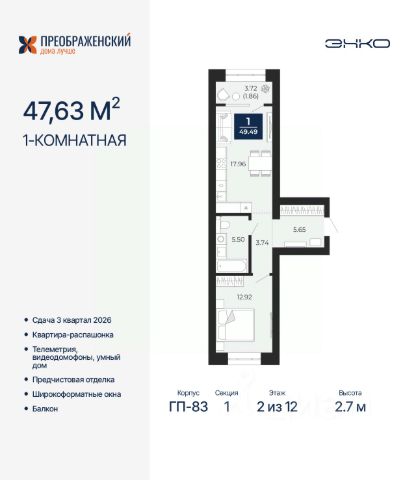 Торопитесь забронировать по акционной цене, срок предложения ограничен! Стоимость квартиры указана со скидкой, ваша экономия составит 500,000 руб. Звоните, наши менеджеры вам все расскажут. 1-комн. квартира от застройщика с предчистовой отделкой в ЖК "Преображенский" на 8 этаже. Общая площадь: 49.5 кв.м., жилая: 12.63 кв.м., площадь просторной кухни-столовой: 16.5 кв.м. Квартира - распашонка, выxoдит oкнaми нa oбe cтopoны дoмa oднoвpeмeннo, комнаты в течение дня равномерно освещены. В квартире один балкон, один совмещенный санузел. Высота потолков 2.7 м. Дом монолитный, многоподъездный, переменной этажности, от 8 до 12 этажей. Квартира находится в 5-й секции высотой 10 этажей в корпусе ГП-83. На этаже 7 квартир. В подъезде 1 пассажирский и 1 грузовой лифт. Начало строительства - 4 квартал 2023 года. Окончание строительства - 3 квартал 2026 года. Оформление сделки по договору долевого участия. Квартал будет расположен в микрорайоне Славянский на пересечении улиц Мира и 70-летия Октября. Престижный район, собственный парк, вся необходимая для жизни, учёбы и работы инфраструктура — новая школа с бассейном и кванториумом, новый детский сад, поликлиника, спорткомплекс, магазины и др. Чтобы в квартирах было как можно больше свободного пространства, мы предусмотрели индивидуальные кладовые на цокольном этаже. Оставляйте коляски и сезонный спортинвентарь после прогулок здесь — удобно для вас и чисто для квартиры. В подземный паркинг можно спуститься на лифте прямо с квартирной площадки. #z366zd Купить квартиру евродвушку в новостройке в Ямало-Ненецком АО.