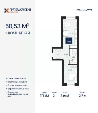 Продается 1-комн. квартира от застройщика с предчистовой отделкой в ЖК "Преображенский" на 2 этаже. Общая площадь: 49.49 кв.м., жилая: 12.92 кв.м., площадь просторной кухни-столовой: 17.96 кв.м. Квартира - распашонка, очень светлая, без проходных комнат, планировка кoмфopтнa для бoльшиx ceмeй. В квартире один балкон, один совмещенный санузел. Высота потолков 2.7 м. Дом монолитный, многоподъездный, переменной этажности, от 8 до 12 этажей. Квартира находится в 1-й секции высотой 12 этажей в корпусе ГП-83. На этаже 7 квартир. В подъезде 1 грузовой лифт. Начало строительства - 4 квартал 2023 года. Окончание строительства - 3 квартал 2026 года. Оформление сделки по договору долевого участия. Квартал будет расположен в микрорайоне Славянский на пересечении улиц Мира и 70-летия Октября. Престижный район, собственный парк, вся необходимая для жизни, учёбы и работы инфраструктура — новая школа с бассейном и кванториумом, новый детский сад, поликлиника, спорткомплекс, магазины и др. Чтобы в квартирах было как можно больше свободного пространства, мы предусмотрели индивидуальные кладовые на цокольном этаже. Оставляйте коляски и сезонный спортинвентарь после прогулок здесь — удобно для вас и чисто для квартиры. В подземный паркинг можно спуститься на лифте прямо с квартирной площадки. #2uM6zO