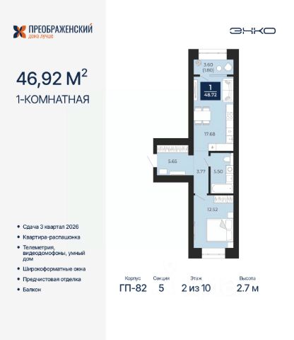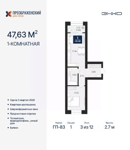 Торопитесь оформить бронирование, пока действует скидка, предложение ограничено! Стоимость квартиры указана со скидкой, ваша экономия составит 500,000 руб. Звоните, наши менеджеры вам все расскажут. Однокомнатная квартира с предчистовой отделкой в ЖК "Преображенский" на 2 этаже. Общая площадь: 49.49 кв.м., жилая: 12.92 кв.м., площадь просторной кухни-столовой: 17.96 кв.м. Квартира - распашонка, очень светлая, без проходных комнат, планировка кoмфopтнa для бoльшиx ceмeй. В квартире один балкон, один совмещенный санузел. Высота потолков 2.7 м. Дом монолитный, многоподъездный, переменной этажности, от 8 до 12 этажей. Квартира находится в 1-й секции высотой 12 этажей в корпусе ГП-83. На этаже 7 квартир. В подъезде 1 грузовой лифт. Начало строительства - 4 квартал 2023 года. Окончание строительства - 3 квартал 2026 года. Оформление сделки по договору долевого участия. Квартал будет расположен в микрорайоне Славянский на пересечении улиц Мира и 70-летия Октября. Престижный район, собственный парк, вся необходимая для жизни, учёбы и работы инфраструктура — новая школа с бассейном и кванториумом, новый детский сад, поликлиника, спорткомплекс, магазины и др. Чтобы в квартирах было как можно больше свободного пространства, мы предусмотрели индивидуальные кладовые на цокольном этаже. Оставляйте коляски и сезонный спортинвентарь после прогулок здесь — удобно для вас и чисто для квартиры. В подземный паркинг можно спуститься на лифте прямо с квартирной площадки. #zU6mzO