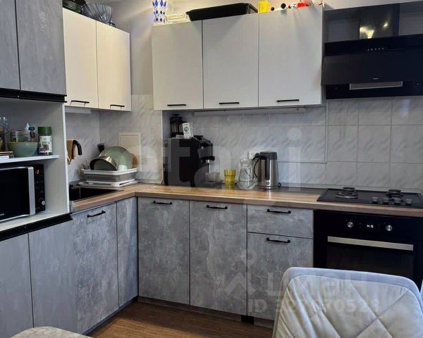 На кухне остаётся кухонный гарнитур и встроенная техника: духовой шкаф, варочная поверхность, микроволновая печь, посудомоечная машина, а также угловой диван.