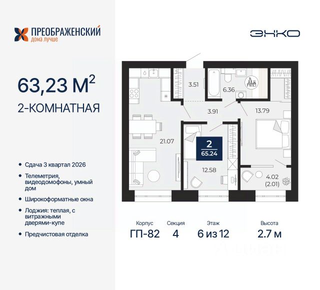 Продается 2-комн. квартира от застройщика с предчистовой отделкой в ЖК "Преображенский" на 6 этаже. Общая площадь: 75.71 кв.м., жилая: 30.63 кв.м., площадь просторной кухни-столовой: 21.6 кв.м. Комнаты изолированные, все окна выходят на одну сторону. В квартире одна лоджия, один совмещенный и один раздельный санузел. Высота потолков 2.7 м. Дом монолитный, многоподъездный, переменной этажности, от 8 до 12 этажей. Квартира находится в 3-й секции высотой 10 этажей в корпусе ГП-82. На этаже 4 квартиры. В подъезде 1 пассажирский и 1 грузовой лифт. Окончание строительства - 3 квартал 2026 года. Оформление сделки по договору долевого участия. Квартал будет расположен в микрорайоне Славянский на пересечении улиц Мира и 70-летия Октября. Престижный район, собственный парк, вся необходимая для жизни, учёбы и работы инфраструктура — новая школа с бассейном и кванториумом, новый детский сад, поликлиника, спорткомплекс, магазины и др. Чтобы в квартирах было как можно больше свободного пространства, мы предусмотрели индивидуальные кладовые на цокольном этаже. Оставляйте коляски и сезонный спортинвентарь после прогулок здесь — удобно для вас и чисто для квартиры. В подземный паркинг можно спуститься на лифте прямо с квартирной площадки. #zmgVdB