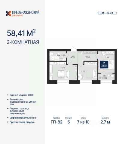 Успейте забронировать на этих условиях, период предложения ограничен! Стоимость квартиры указана со скидкой, ваша экономия составит 500,000 руб. Информация по телефону, мы вам все подробно расскажем. 2-комн. квартира с предчистовой отделкой в ЖК "Преображенский" на 7 этаже. Общая площадь: 60.22 кв.м., жилая: 23.54 кв.м., площадь просторной кухни-столовой: 15.98 кв.м. Комнаты изолированные, все окна выходят на одну сторону. В квартире одна лоджия, один совмещенный санузел. Высота потолков 2.7 м. Дом монолитный, многоподъездный, переменной этажности, от 8 до 12 этажей. Квартира находится в 5-й секции высотой 10 этажей в корпусе ГП-82. На этаже 7 квартир. В подъезде 1 пассажирский и 1 грузовой лифт. Окончание строительства - 3 квартал 2026 года. Оформление сделки по договору долевого участия. Квартал будет расположен в микрорайоне Славянский на пересечении улиц Мира и 70-летия Октября. Престижный район, собственный парк, вся необходимая для жизни, учёбы и работы инфраструктура — новая школа с бассейном и кванториумом, новый детский сад, поликлиника, спорткомплекс, магазины и др. Чтобы в квартирах было как можно больше свободного пространства, мы предусмотрели индивидуальные кладовые на цокольном этаже. Оставляйте коляски и сезонный спортинвентарь после прогулок здесь — удобно для вас и чисто для квартиры. В подземный паркинг можно спуститься на лифте прямо с квартирной площадки. #ZWf2eb