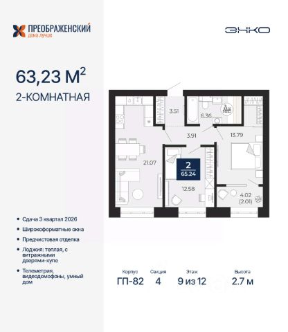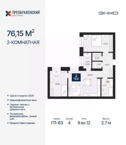 Успейте оформить бронирование, пока действует скидка, предложение ограничено! Стоимость квартиры указана со скидкой, ваша экономия составит 500,000 руб. По всем вопросам обращайтесь в офис продаж, мы вам все подробно расскажем. Просторная 2-комн. квартира с предчистовой отделкой в ЖК "Преображенский" на 9 этаже. Общая площадь: 78.1 кв.м., жилая: 29.52 кв.м., площадь просторной кухни-столовой: 25.97 кв.м. Квартира угловая, идеально подойдет любителям тишины и панорамных видов. В квартире одна лоджия, один раздельный санузел. Высота потолков 2.7 м. Дом монолитный, многоподъездный, переменной этажности, от 8 до 12 этажей. Квартира находится в 4-й секции высотой 12 этажей в корпусе ГП-83. На этаже 6 квартир. В подъезде 1 пассажирский и 1 грузовой лифт. Начало строительства - 4 квартал 2023 года. Окончание строительства - 3 квартал 2026 года. Оформление сделки по договору долевого участия. Квартал будет расположен в микрорайоне Славянский на пересечении улиц Мира и 70-летия Октября. Престижный район, собственный парк, вся необходимая для жизни, учёбы и работы инфраструктура — новая школа с бассейном и кванториумом, новый детский сад, поликлиника, спорткомплекс, магазины и др. Чтобы в квартирах было как можно больше свободного пространства, мы предусмотрели индивидуальные кладовые на цокольном этаже. Оставляйте коляски и сезонный спортинвентарь после прогулок здесь — удобно для вас и чисто для квартиры. В подземный паркинг можно спуститься на лифте прямо с квартирной площадки. #2u66Wc