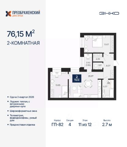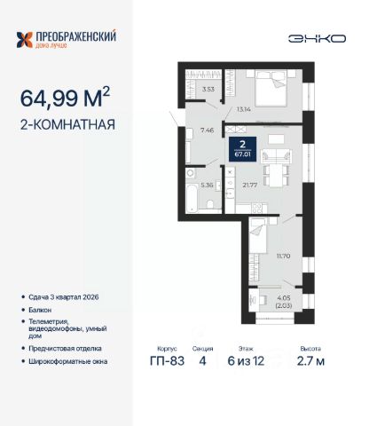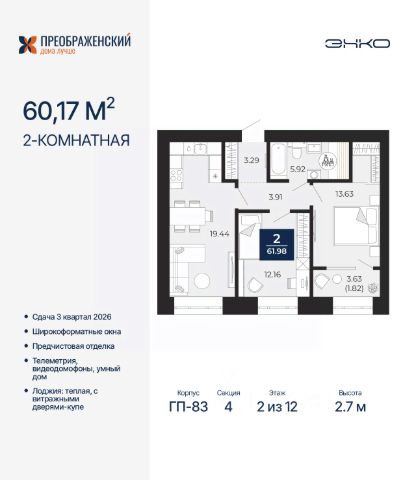Торопитесь оформить бронирование по этой цене! Предложение ограничено! Стоимость квартиры указана со скидкой, ваша экономия составит 680,950 RUB. Информация по телефону, мы вам все подробно расскажем! Просторная 2-комн. квартира с предчистовой отделкой в ЖК "Преображенский" на 7 этаже. Общая площадь: 60.68 кв.м., жилая: 27.54 кв.м., площадь просторной кухни-столовой: 15.98 кв.м. Комнаты изолированные, все окна выходят на одну сторону. В квартире один совмещенный санузел. Высота потолков 2.7 м. Дом монолитный, многоподъездный, переменной этажности, от 8 до 12 этажей. Квартира находится в 1-й секции высотой 12 этажей в корпусе ГП-82. На этаже 7 квартир. В подъезде 1 пассажирский и 1 грузовой лифт. Окончание строительства - 3 квартал 2026 года. Оформление сделки по договору долевого участия. Квартал будет расположен в микрорайоне Славянский на пересечении улиц Мира и 70-летия Октября. Престижный район, собственный парк, вся необходимая для жизни, учёбы и работы инфраструктура — новая школа с бассейном и кванториумом, новый детский сад, поликлиника, спорткомплекс, магазины и др. Чтобы в квартирах было как можно больше свободного пространства, мы предусмотрели индивидуальные кладовые на цокольном этаже. Оставляйте коляски и сезонный спортинвентарь после прогулок здесь — удобно для вас и чисто для квартиры. В подземный паркинг можно спуститься на лифте прямо с квартирной площадки. #ZmD3FW Продам 2-комнатную квартиру в монолитном доме в Ямало-Ненецком АО.