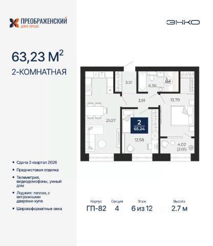 Двухкомнатная квартира с предчистовой отделкой в ЖК "Преображенский" на 2 этаже. Общая площадь: 57.18 кв.м., жилая: 22.67 кв.м., площадь просторной кухни-столовой: 15.33 кв.м. Комнаты изолированные, все окна выходят на одну сторону. В квартире одна лоджия, один совмещенный санузел. Высота потолков 2.7 м. Дом монолитный, многоподъездный, переменной этажности, от 8 до 12 этажей. Квартира находится в 5-й секции высотой 10 этажей в корпусе ГП-82. На этаже 7 квартир. В подъезде 1 пассажирский и 1 грузовой лифт. Окончание строительства - 3 квартал 2026 года. Оформление сделки по договору долевого участия. Квартал будет расположен в микрорайоне Славянский на пересечении улиц Мира и 70-летия Октября. Престижный район, собственный парк, вся необходимая для жизни, учёбы и работы инфраструктура — новая школа с бассейном и кванториумом, новый детский сад, поликлиника, спорткомплекс, магазины и др. Чтобы в квартирах было как можно больше свободного пространства, мы предусмотрели индивидуальные кладовые на цокольном этаже. Оставляйте коляски и сезонный спортинвентарь после прогулок здесь — удобно для вас и чисто для квартиры. В подземный паркинг можно спуститься на лифте прямо с квартирной площадки. #2so97f Продается 2-комнатная квартира от застройщика в Ямало-Ненецком АО.