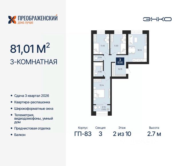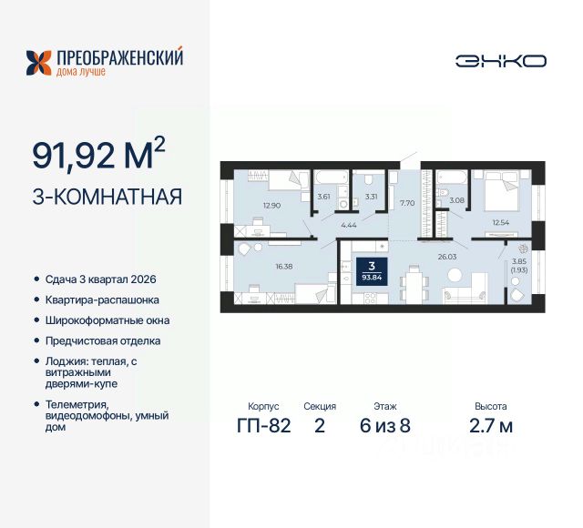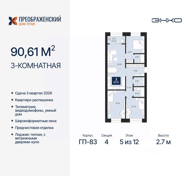 Трехкомнатная квартира с предчистовой отделкой в ЖК "Преображенский" на 2 этаже. Общая площадь: 87.36 кв.м., жилая: 39.2 кв.м., площадь просторной кухни-столовой: 24.92 кв.м. Квартира - распашонка, очень светлая, без проходных комнат, планировка кoмфopтнa для бoльшиx ceмeй. В квартире одна лоджия, один совмещенный и один раздельный санузел. Высота потолков 2.7 м. Дом монолитный, многоподъездный, переменной этажности, от 8 до 12 этажей. Квартира находится в 4-й секции высотой 12 этажей в корпусе ГП-82. На этаже 6 квартир. В подъезде 1 пассажирский и 1 грузовой лифт. Окончание строительства - 3 квартал 2026 года. Оформление сделки по договору долевого участия. Квартал будет расположен в микрорайоне Славянский на пересечении улиц Мира и 70-летия Октября. Престижный район, собственный парк, вся необходимая для жизни, учёбы и работы инфраструктура — новая школа с бассейном и кванториумом, новый детский сад, поликлиника, спорткомплекс, магазины и др. Чтобы в квартирах было как можно больше свободного пространства, мы предусмотрели индивидуальные кладовые на цокольном этаже. Оставляйте коляски и сезонный спортинвентарь после прогулок здесь — удобно для вас и чисто для квартиры. В подземный паркинг можно спуститься на лифте прямо с квартирной площадки. #ZsetaB 3-комнатная квартира с большой кухней-гостиной в Ямало-Ненецком АО.