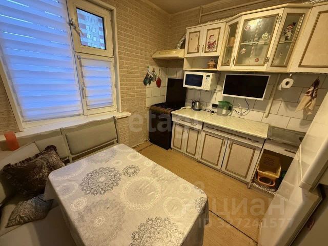 На кухне остаётся кухонный гарнитур и встроенная техника: духовой шкаф, варочная поверхность, микроволновая печь, посудомоечная машина, а также угловой диван.