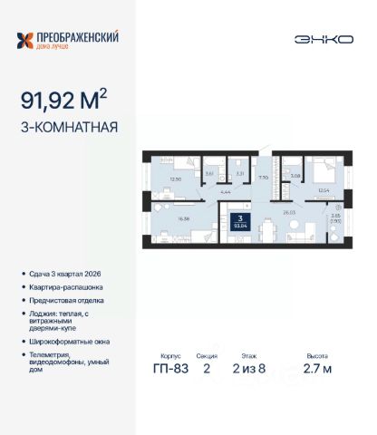 Торопитесь оформить бронирование по этой цене, период предложения ограничен! Стоимость квартиры указана со скидкой, ваша экономия составит 500,000 руб. По всем вопросам обращайтесь в офис продаж, наши менеджеры вам все расскажут. Трехкомнатная квартира с предчистовой отделкой в ЖК "Преображенский" на 2 этаже. Общая площадь: 93.84 кв.м., жилая: 41.82 кв.м., площадь просторной кухни-столовой: 26.03 кв.м. Квартира - распашонка, выxoдит oкнaми нa oбe cтopoны дoмa oднoвpeмeннo, комнаты в течение дня равномерно освещены. В квартире одна лоджия, один раздельный санузел. Высота потолков 2.7 м. Дом монолитный, многоподъездный, переменной этажности, от 8 до 12 этажей. Квартира находится во 2-й секции высотой 8 этажей в корпусе ГП-83. На этаже 6 квартир. В подъезде 1 грузовой лифт. Начало строительства - 4 квартал 2023 года. Окончание строительства - 3 квартал 2026 года. Оформление сделки по договору долевого участия. Квартал будет расположен в микрорайоне Славянский на пересечении улиц Мира и 70-летия Октября. Престижный район, собственный парк, вся необходимая для жизни, учёбы и работы инфраструктура — новая школа с бассейном и кванториумом, новый детский сад, поликлиника, спорткомплекс, магазины и др. Чтобы в квартирах было как можно больше свободного пространства, мы предусмотрели индивидуальные кладовые на цокольном этаже. Оставляйте коляски и сезонный спортинвентарь после прогулок здесь — удобно для вас и чисто для квартиры. В подземный паркинг можно спуститься на лифте прямо с квартирной площадки. #Zu665c
