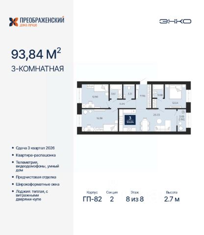 Продается трехкомнатная квартира от застройщика с предчистовой отделкой в ЖК "Преображенский" на 8 этаже. Общая площадь: 110.2 кв.м., жилая: 50.43 кв.м., площадь просторной кухни-столовой: 35.02 кв.м. Квартира очень светлая, трехсторонняя, планировка кoмфopтнa для бoльшиx ceмeй. В квартире два совмещенных санузла. Высота потолков 2.7 м. Дом монолитный, многоподъездный, переменной этажности, от 8 до 12 этажей. Квартира находится в 1-й секции высотой 12 этажей в корпусе ГП-82. На этаже 7 квартир. В подъезде 1 пассажирский и 1 грузовой лифт. Окончание строительства - 3 квартал 2026 года. Оформление сделки по договору долевого участия. Квартал будет расположен в микрорайоне Славянский на пересечении улиц Мира и 70-летия Октября. Престижный район, собственный парк, вся необходимая для жизни, учёбы и работы инфраструктура — новая школа с бассейном и кванториумом, новый детский сад, поликлиника, спорткомплекс, магазины и др. Чтобы в квартирах было как можно больше свободного пространства, мы предусмотрели индивидуальные кладовые на цокольном этаже. Оставляйте коляски и сезонный спортинвентарь после прогулок здесь — удобно для вас и чисто для квартиры. В подземный паркинг можно спуститься на лифте прямо с квартирной площадки. #Z4FZMg