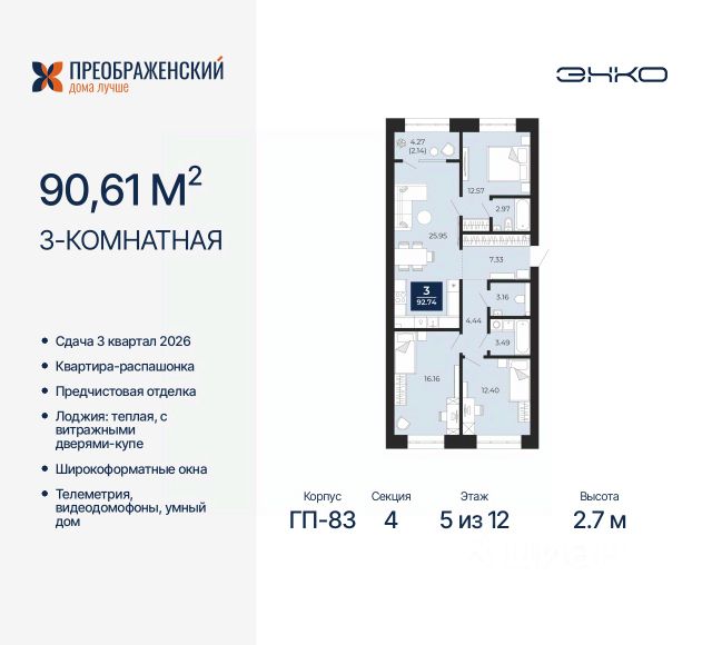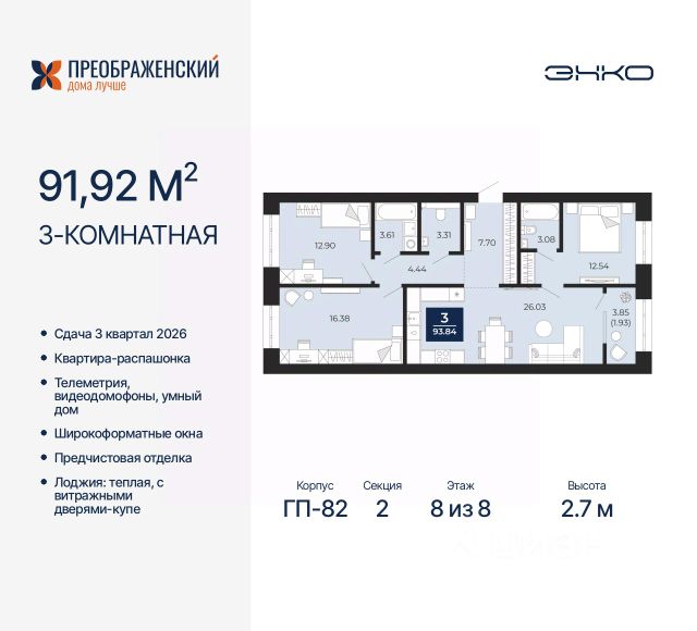 3-комн. квартира от застройщика с предчистовой отделкой в ЖК "Преображенский" на 2 этаже. Общая площадь: 87.36 кв.м., жилая: 39.2 кв.м., площадь просторной кухни-столовой: 24.92 кв.м. Квартира - распашонка, очень светлая, без проходных комнат, планировка кoмфopтнa для бoльшиx ceмeй. В квартире одна лоджия, один совмещенный и один раздельный санузел. Высота потолков 2.7 м. Дом монолитный, многоподъездный, переменной этажности, от 8 до 12 этажей. Квартира находится в 4-й секции высотой 12 этажей в корпусе ГП-82. На этаже 6 квартир. В подъезде 1 пассажирский и 1 грузовой лифт. Окончание строительства - 3 квартал 2026 года. Оформление сделки по договору долевого участия. Квартал будет расположен в микрорайоне Славянский на пересечении улиц Мира и 70-летия Октября. Престижный район, собственный парк, вся необходимая для жизни, учёбы и работы инфраструктура — новая школа с бассейном и кванториумом, новый детский сад, поликлиника, спорткомплекс, магазины и др. Чтобы в квартирах было как можно больше свободного пространства, мы предусмотрели индивидуальные кладовые на цокольном этаже. Оставляйте коляски и сезонный спортинвентарь после прогулок здесь — удобно для вас и чисто для квартиры. В подземный паркинг можно спуститься на лифте прямо с квартирной площадки. #zSETAB Продается 3-комнатная квартира с евроремонтом в Новом Уренгое.