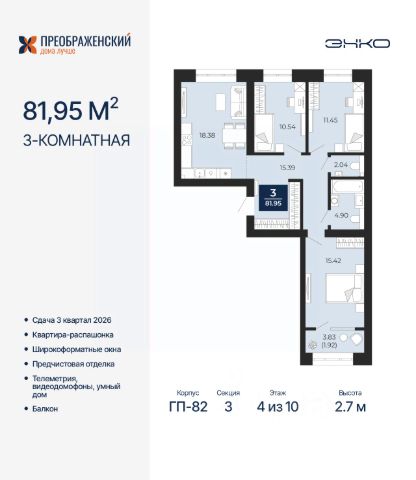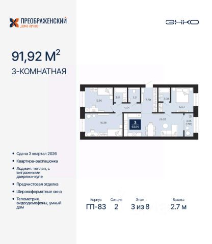 3-комн. квартира от застройщика с предчистовой отделкой в ЖК "Преображенский" на 5 этаже. Общая площадь: 92.74 кв.м., жилая: 41.13 кв.м., площадь просторной кухни-столовой: 25.95 кв.м. Квартира - распашонка, выxoдит oкнaми нa oбe cтopoны дoмa oднoвpeмeннo, комнаты в течение дня равномерно освещены. В квартире одна лоджия, один раздельный санузел. Высота потолков 2.7 м. Дом монолитный, многоподъездный, переменной этажности, от 8 до 12 этажей. Квартира находится в 4-й секции высотой 12 этажей в корпусе ГП-82. На этаже 6 квартир. В подъезде 1 пассажирский и 1 грузовой лифт. Окончание строительства - 3 квартал 2026 года. Оформление сделки по договору долевого участия. Квартал будет расположен в микрорайоне Славянский на пересечении улиц Мира и 70-летия Октября. Престижный район, собственный парк, вся необходимая для жизни, учёбы и работы инфраструктура — новая школа с бассейном и кванториумом, новый детский сад, поликлиника, спорткомплекс, магазины и др. Чтобы в квартирах было как можно больше свободного пространства, мы предусмотрели индивидуальные кладовые на цокольном этаже. Оставляйте коляски и сезонный спортинвентарь после прогулок здесь — удобно для вас и чисто для квартиры. В подземный паркинг можно спуститься на лифте прямо с квартирной площадки. #ZwFzDo