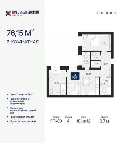 Продается 2-комн. квартира от застройщика с предчистовой отделкой в ЖК "Преображенский" на 10 этаже. Общая площадь: 60.22 кв.м., жилая: 23.54 кв.м., площадь просторной кухни-столовой: 15.98 кв.м. Комнаты изолированные, все окна выходят на одну сторону. В квартире одна лоджия, один совмещенный санузел. Высота потолков 2.7 м. Дом монолитный, многоподъездный, переменной этажности, от 8 до 12 этажей. Квартира находится в 5-й секции высотой 10 этажей в корпусе ГП-83. На этаже 7 квартир. В подъезде 1 пассажирский и 1 грузовой лифт. Начало строительства - 4 квартал 2023 года. Окончание строительства - 3 квартал 2026 года. Оформление сделки по договору долевого участия. Квартал будет расположен в микрорайоне Славянский на пересечении улиц Мира и 70-летия Октября. Престижный район, собственный парк, вся необходимая для жизни, учёбы и работы инфраструктура — новая школа с бассейном и кванториумом, новый детский сад, поликлиника, спорткомплекс, магазины и др. Чтобы в квартирах было как можно больше свободного пространства, мы предусмотрели индивидуальные кладовые на цокольном этаже. Оставляйте коляски и сезонный спортинвентарь после прогулок здесь — удобно для вас и чисто для квартиры. В подземный паркинг можно спуститься на лифте прямо с квартирной площадки. #zumMu3