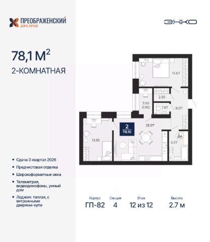 Двухкомнатная квартира с предчистовой отделкой в ЖК "Преображенский" на 12 этаже. Общая площадь: 65.24 кв.м., жилая: 26.37 кв.м., площадь просторной кухни-столовой: 21.07 кв.м. Комнаты изолированные, все окна выходят на одну сторону. В квартире одна лоджия, один совмещенный санузел. Высота потолков 2.7 м. Дом монолитный, многоподъездный, переменной этажности, от 8 до 12 этажей. Квартира находится в 4-й секции высотой 12 этажей в корпусе ГП-82. На этаже 6 квартир. В подъезде 1 пассажирский и 1 грузовой лифт. Окончание строительства - 3 квартал 2026 года. Оформление сделки по договору долевого участия. Квартал будет расположен в микрорайоне Славянский на пересечении улиц Мира и 70-летия Октября. Престижный район, собственный парк, вся необходимая для жизни, учёбы и работы инфраструктура — новая школа с бассейном и кванториумом, новый детский сад, поликлиника, спорткомплекс, магазины и др. Чтобы в квартирах было как можно больше свободного пространства, мы предусмотрели индивидуальные кладовые на цокольном этаже. Оставляйте коляски и сезонный спортинвентарь после прогулок здесь — удобно для вас и чисто для квартиры. В подземный паркинг можно спуститься на лифте прямо с квартирной площадки. #2wFzb4