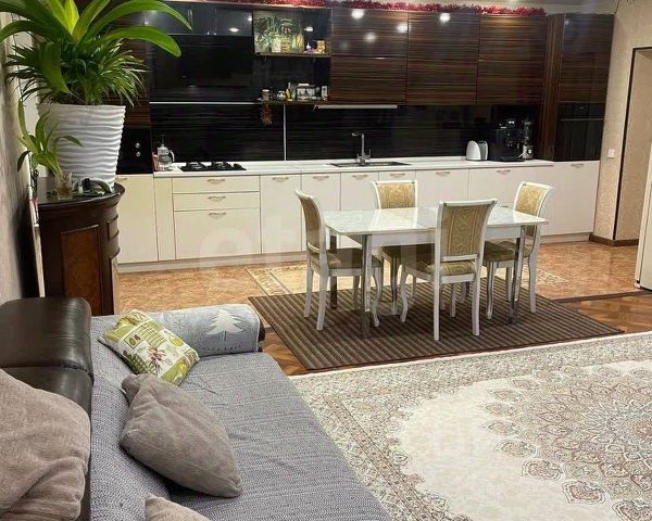 На кухне остаётся кухонный гарнитур и встроенная техника: духовой шкаф, варочная поверхность, микроволновая печь, посудомоечная машина, а также угловой диван.