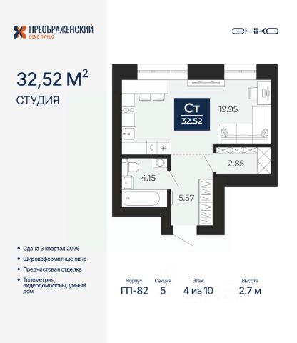 Однокомнатная квартира-студия с предчистовой отделкой в ЖК "Преображенский" на 4 этаже. Общая площадь: 32.52 кв.м., площадь гостиной 19.95 кв.м., из которых 10 кв.м. выделено под кухонную зону. Все окна выходят на одну сторону. В квартире один совмещенный санузел. Высота потолков 2.7 м. Дом монолитный, многоподъездный, переменной этажности, от 8 до 12 этажей. Квартира находится в 5-й секции высотой 10 этажей в корпусе ГП-82. На этаже 7 квартир. В подъезде 1 пассажирский и 1 грузовой лифт. Окончание строительства - 3 квартал 2026 года. Оформление сделки по договору долевого участия. Квартал будет расположен в микрорайоне Славянский на пересечении улиц Мира и 70-летия Октября. Престижный район, собственный парк, вся необходимая для жизни, учёбы и работы инфраструктура — новая школа с бассейном и кванториумом, новый детский сад, поликлиника, спорткомплекс, магазины и др. Чтобы в квартирах было как можно больше свободного пространства, мы предусмотрели индивидуальные кладовые на цокольном этаже. Оставляйте коляски и сезонный спортинвентарь после прогулок здесь — удобно для вас и чисто для квартиры. В подземный паркинг можно спуститься на лифте прямо с квартирной площадки. #2WFzF5