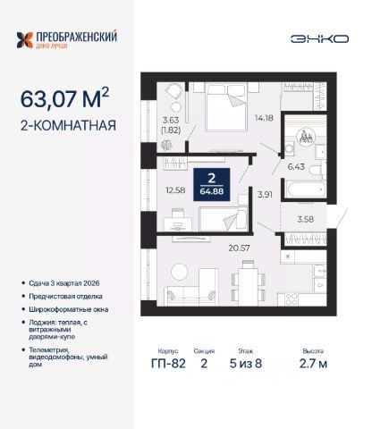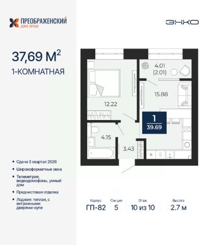 Торопитесь забронировать, пока действует скидка! Предложение ограничено! Стоимость квартиры указана со скидкой, ваша экономия составит 399,755 RUB. Информация по телефону, наши менеджеры вам все расскажут! 1-комн. квартира-студия от застройщика с предчистовой отделкой в ЖК "Преображенский" на 10 этаже. Общая площадь: 32.52 кв.м., площадь гостиной 19.95 кв.м., из которых 5 кв.м. выделено под кухонную зону. Все окна выходят на одну сторону. В квартире один совмещенный санузел. Высота потолков 2.7 м. Дом монолитный, многоподъездный, переменной этажности, от 8 до 12 этажей. Квартира находится в 5-й секции высотой 10 этажей в корпусе ГП-83. На этаже 7 квартир. В подъезде 1 пассажирский и 1 грузовой лифт. Начало строительства - 4 квартал 2023 года. Окончание строительства - 3 квартал 2026 года. Оформление сделки по договору долевого участия. Квартал будет расположен в микрорайоне Славянский на пересечении улиц Мира и 70-летия Октября. Престижный район, собственный парк, вся необходимая для жизни, учёбы и работы инфраструктура — новая школа с бассейном и кванториумом, новый детский сад, поликлиника, спорткомплекс, магазины и др. Чтобы в квартирах было как можно больше свободного пространства, мы предусмотрели индивидуальные кладовые на цокольном этаже. Оставляйте коляски и сезонный спортинвентарь после прогулок здесь — удобно для вас и чисто для квартиры. В подземный паркинг можно спуститься на лифте прямо с квартирной площадки. #Z35FC9