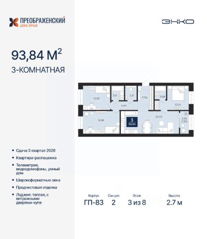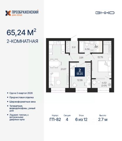 Просторная 2-комн. квартира с предчистовой отделкой в ЖК "Преображенский" на 3 этаже. Общая площадь: 76.14 кв.м., жилая: 28.71 кв.м., площадь просторной кухни-столовой: 25.4 кв.м. Квартира угловая, очень светлая, естественная вентиляция при открытии окон. В квартире одна лоджия, один раздельный санузел. Высота потолков 2.7 м. Дом монолитный, многоподъездный, переменной этажности, от 8 до 12 этажей. Квартира находится во 2-й секции высотой 8 этажей в корпусе ГП-82. На этаже 6 квартир. В подъезде 1 пассажирский и 1 грузовой лифт. Окончание строительства - 3 квартал 2026 года. Оформление сделки по договору долевого участия. Квартал будет расположен в микрорайоне Славянский на пересечении улиц Мира и 70-летия Октября. Престижный район, собственный парк, вся необходимая для жизни, учёбы и работы инфраструктура — новая школа с бассейном и кванториумом, новый детский сад, поликлиника, спорткомплекс, магазины и др. Чтобы в квартирах было как можно больше свободного пространства, мы предусмотрели индивидуальные кладовые на цокольном этаже. Оставляйте коляски и сезонный спортинвентарь после прогулок здесь — удобно для вас и чисто для квартиры. В подземный паркинг можно спуститься на лифте прямо с квартирной площадки. #zWfzgv
