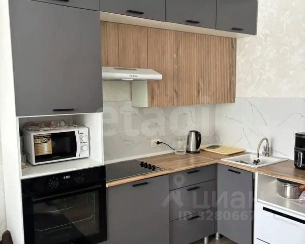- кухонный гарнитур, варочная панель, духовой шкаф, вытяжка, холодильник, микроволновка, стиральная машина с сушкой, стол и стулья натуральное дерево, мини-диван, шторы.