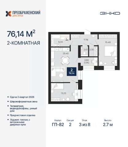 Двухкомнатная квартира с предчистовой отделкой в ЖК "Преображенский" на 2 этаже. Общая площадь: 57.18 кв.м., жилая: 22.67 кв.м., площадь просторной кухни-столовой: 15.33 кв.м. Комнаты изолированные, все окна выходят на одну сторону. В квартире одна лоджия, один совмещенный санузел. Высота потолков 2.7 м. Дом монолитный, многоподъездный, переменной этажности, от 8 до 12 этажей. Квартира находится в 5-й секции высотой 10 этажей в корпусе ГП-82. На этаже 7 квартир. В подъезде 1 пассажирский и 1 грузовой лифт. Окончание строительства - 3 квартал 2026 года. Оформление сделки по договору долевого участия. Квартал будет расположен в микрорайоне Славянский на пересечении улиц Мира и 70-летия Октября. Престижный район, собственный парк, вся необходимая для жизни, учёбы и работы инфраструктура — новая школа с бассейном и кванториумом, новый детский сад, поликлиника, спорткомплекс, магазины и др. Чтобы в квартирах было как можно больше свободного пространства, мы предусмотрели индивидуальные кладовые на цокольном этаже. Оставляйте коляски и сезонный спортинвентарь после прогулок здесь — удобно для вас и чисто для квартиры. В подземный паркинг можно спуститься на лифте прямо с квартирной площадки. #25OgTf