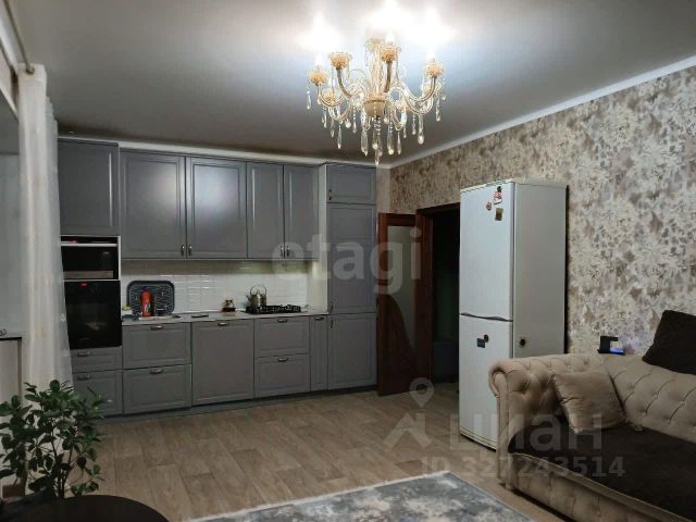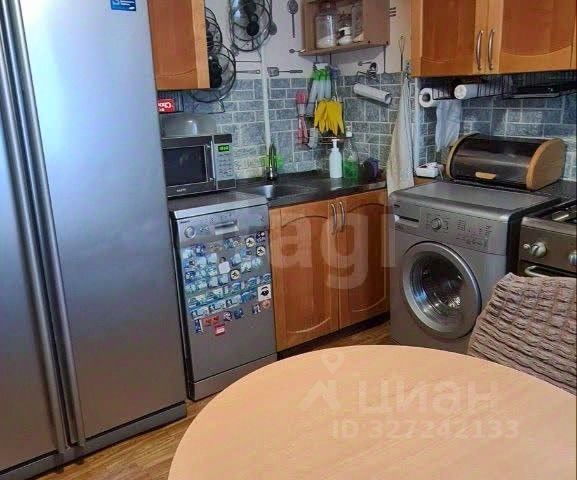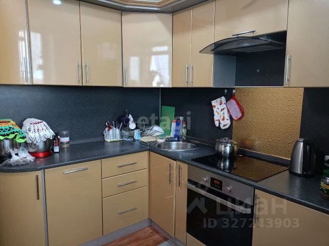 На кухне остаётся кухонный гарнитур и встроенная техника: духовой шкаф, варочная поверхность, микроволновая печь, посудомоечная машина, а также угловой диван.