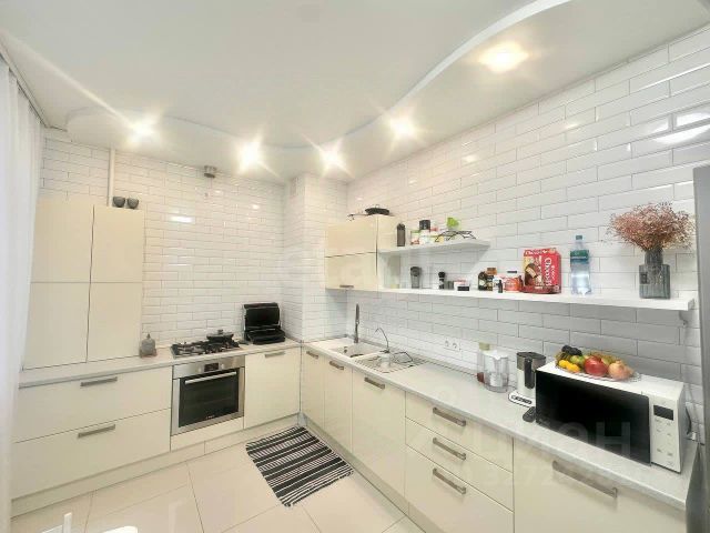 По всей квартире установлен натяжной потолок. При продаже также остается кухонный гарнитур со встроенной бытовой техникой (варочная поверность, духовой шкаф, посудомойка, микроволновая печь). В каждой комнате установлены деревянные двери никаких арок. Квартира меблирована и оборудована бытовой техникой необходимой для комфортного проживания. Окна квартиры выходят на солнечную сторону, из которых можно обозревать новую развязку.