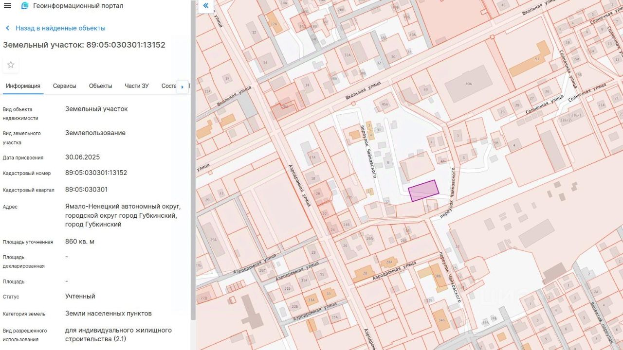 Адрес (описание местоположения): Российская Федерация, Ямало-Ненецкий автономный округ, городской округ город Губкинский, город Губкинский, переулок Чайковского, земельный участок 16. Площадь земельного участка 860 кв.м. Кадастровый номер 89:05:030301:13152. Разрешенное использование: для индивидуального жилищного строительства (2.1). Категория земельного участка: земли населенных пунктов. Территориальная зона - зона застройки индивидуальными жилыми домами (Ж-1)