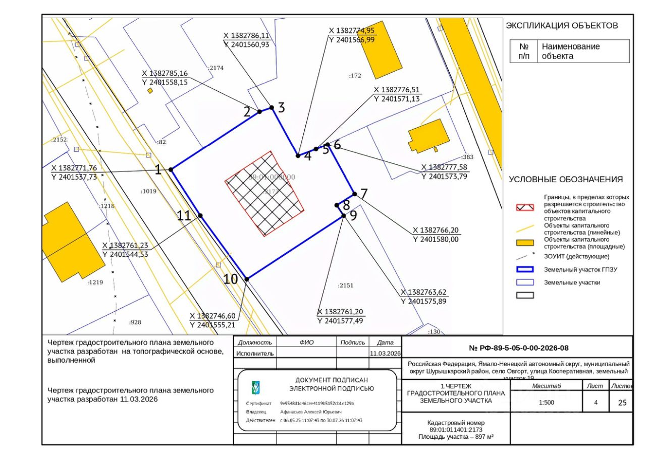 Земельный участок с кадастровым номером 89:01:011401:2173, площадь 897 кв.м. Категория земель — земли населённых пунктов, вид разрешенного использования: блокированная жилая застройка. Код "2.3." по адресу Российская Федерация, Ямало-Ненецкий автономный округ, муниципальный округ Шурышкарский район, с. ОВГОРТ улица Кооперативная, земельный участок 19