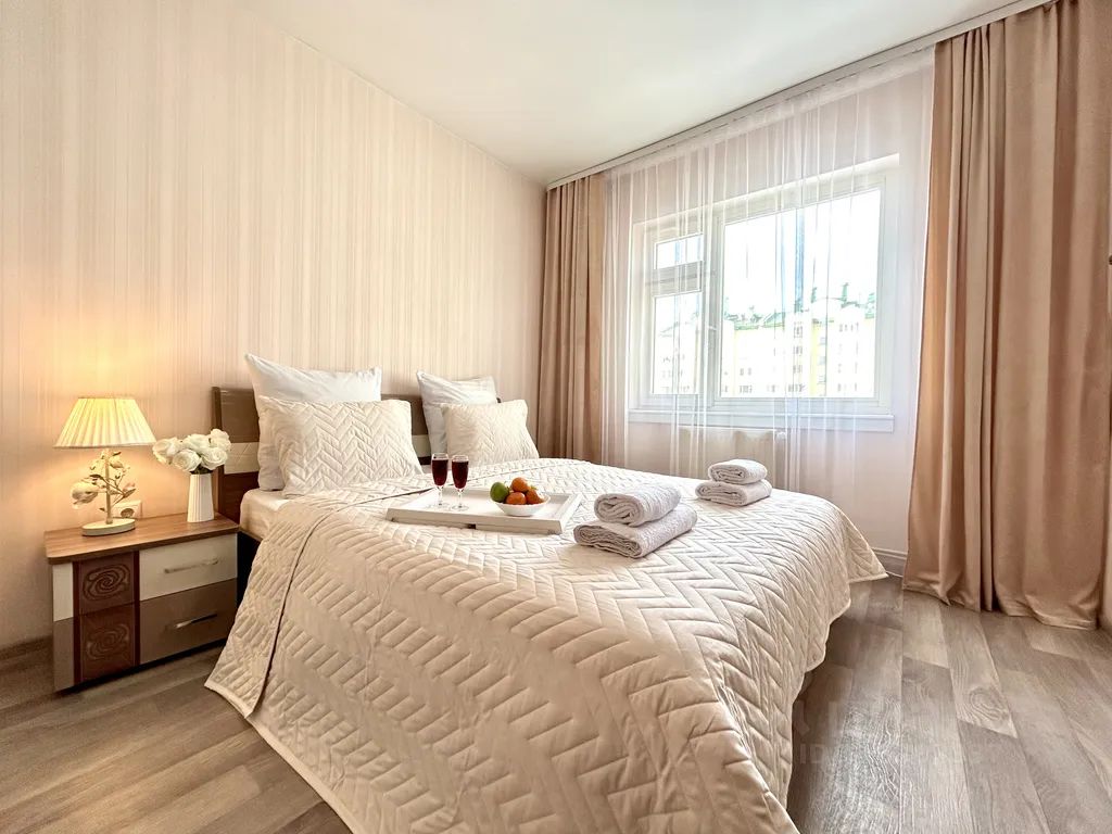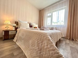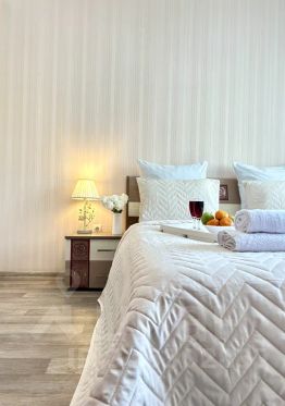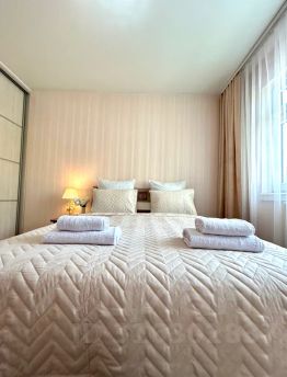 - Удобная большая двуспальная кровать с выглаженным постельным бельём из качественного материала (хлопок) в одной комнате; большой и удобный раскладной диван во второй комнате. Спальных мест (2+2).