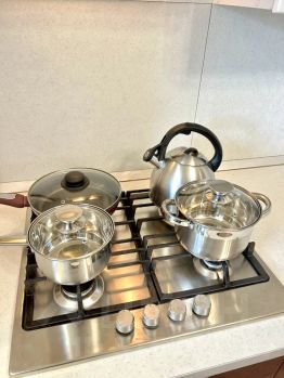 - Полностью оборудованная кухня: посудомоечная машина, столовые приборы, набор посуды, микроволновая печь, духовка и многое другое, необходимое для приготовления пищи;