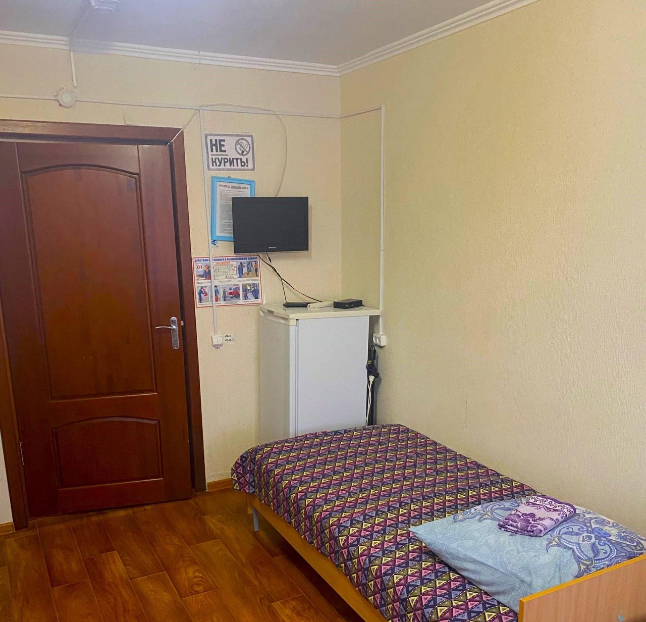 В номере: односпальная кровать, прикроватная тумба, телевизор.