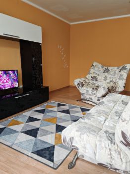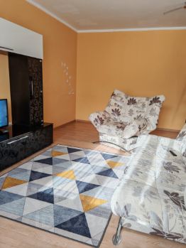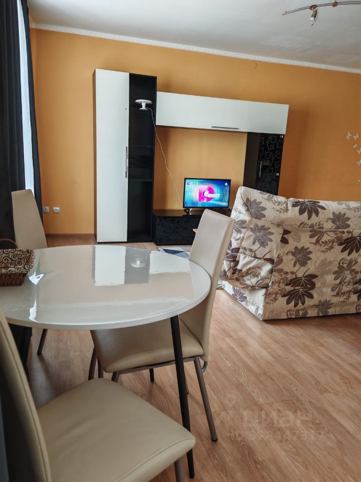 Студия обородована необходимой эл.техникой для комфорной жизни (новый кухонный гарнитур с газовой плитой, новый холодильник, микроволновая печь, телевизор со смарт ТВ, эл.чайник, стиральная машина) и мебелью ( стенка, диван раскладной, кресло, стол, стулья). А так же имеется небольшой набор посуды и постельные принадлежности.