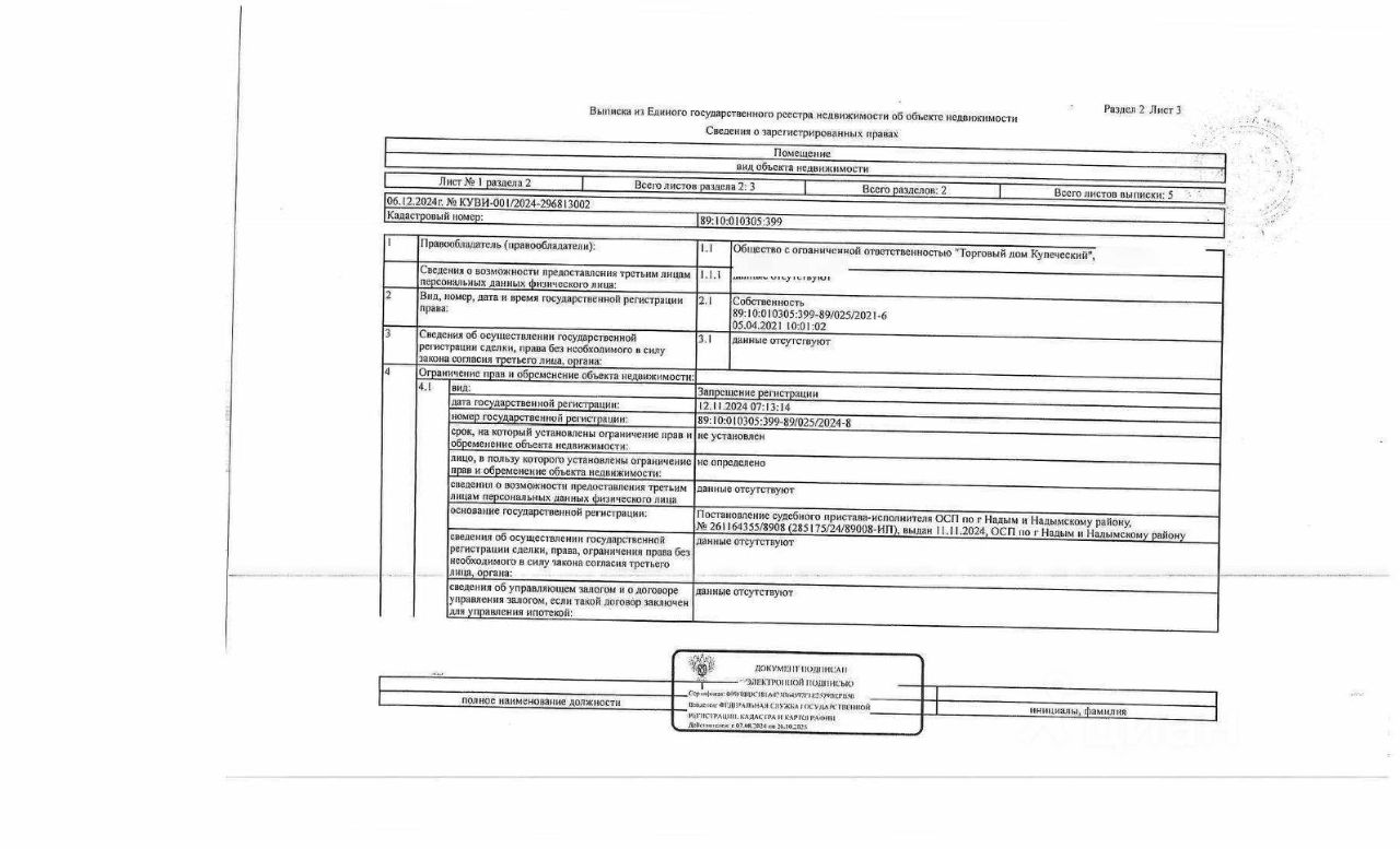 Должник: ООО "Торговый Дом Купеческий", собственник: ООО "Торговый Дом Купеческий" Лот: Нежилое помещение (часть административного здания), площадь 2298,9 кв.м., кадастровый номер: 89:10:010305:399, г. Надым, ул. Заводская, Проезд 5, н/ц: 50060800 р, з-к: 7509120 р, код: 0001, рег. 25-243-ГМУ;