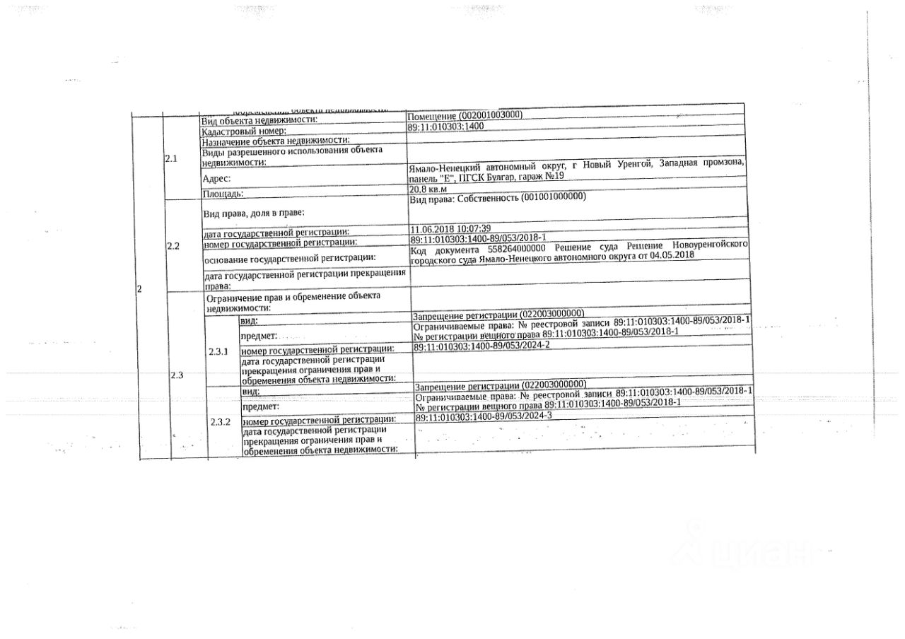 Должник: Яворский М.М., собственник: Яворский М.М. Лот: Нежилое помещение, площадь 20,8 кв.м., кадастровый номер: 89:11:010303:1400, г. Новый Уренгой, Западная промзона, панель "Е", ПГСК Булгар, гараж 19, н/ц: 1143200 р, з-к: 171480 р, код: 0001, рег. 26-5
