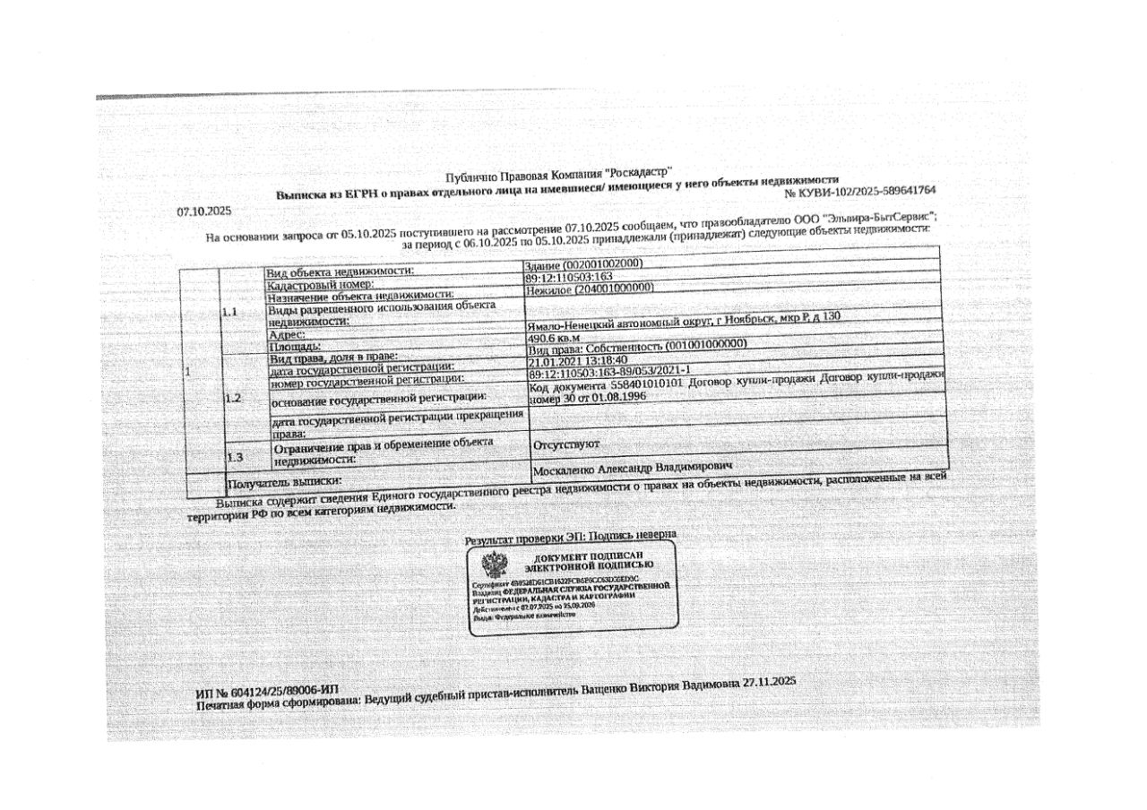 Должник: ООО "Эльвира-БытСервис", собственник: ООО "Эльвира-БытСервис" Лот: Нежилое здание, площадь 490,6 кв.м., кадастровый номер: 89:12:110503:163, г. Ноябрьск, мкр. Р, д. 130 (земельный участок с кадастровым номером 89:12:110508:2 - в аренде), н/ц: 4885400 р, з-к: 732810 р, код: 0001, рег. 26-17-ГМУ