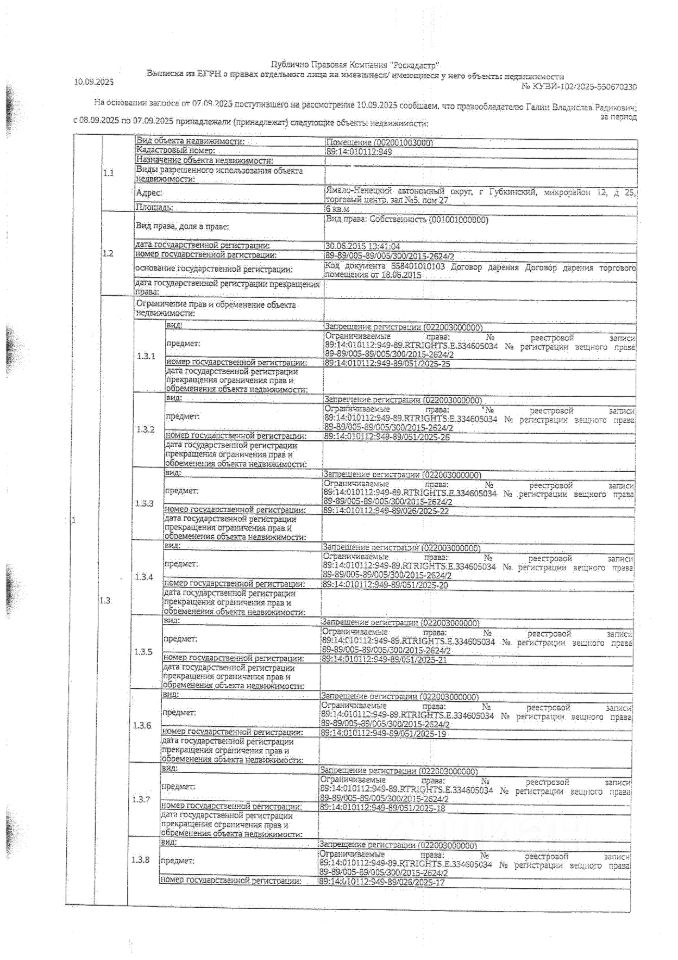 Должник: Галин В.Р., собственник: Галин В.Р. Лот: Помещение, площадь 6 кв.м., кадастровый номер: 89:14:010112:949, г. Губкинский, мкр. 12, д. 25, торговый центр, зал 5, пом. 27, н/ц: 384000 р, з-к: 57600 р, код: 0001, рег. 26-16