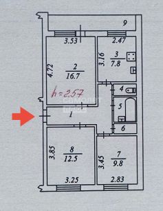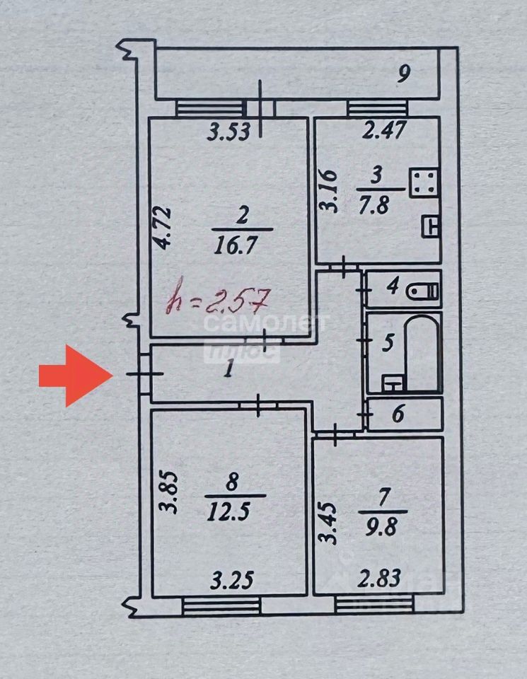Общая площадь: 61,2 кв.м (3 изолированные комнаты)
