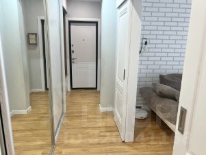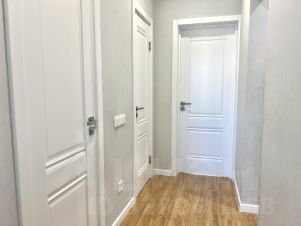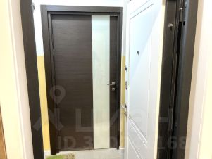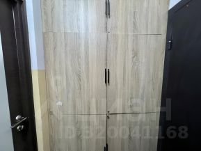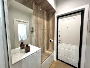 Входная группа перед квартирой оборудована дверью, встроенными шкафами и плиткой на полу.