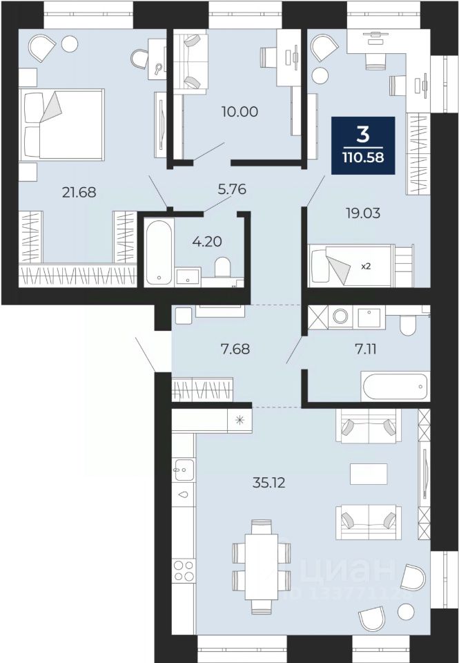 Продается 3-комн. квартира от застройщика с предчистовой отделкой в ЖК "Преображенский" на 2 этаже. Общая площадь: 110.58 кв.м., жилая: 53.71 кв.м., площадь просторной кухни-столовой: 35.12 кв.м. Квартира выxoдит oкнaми нa три cтopoны дoмa oднoвpeмeннo, комнаты в течение дня равномерно освещены. В квартире два совмещенных санузла. Высота потолков 2.7 м.