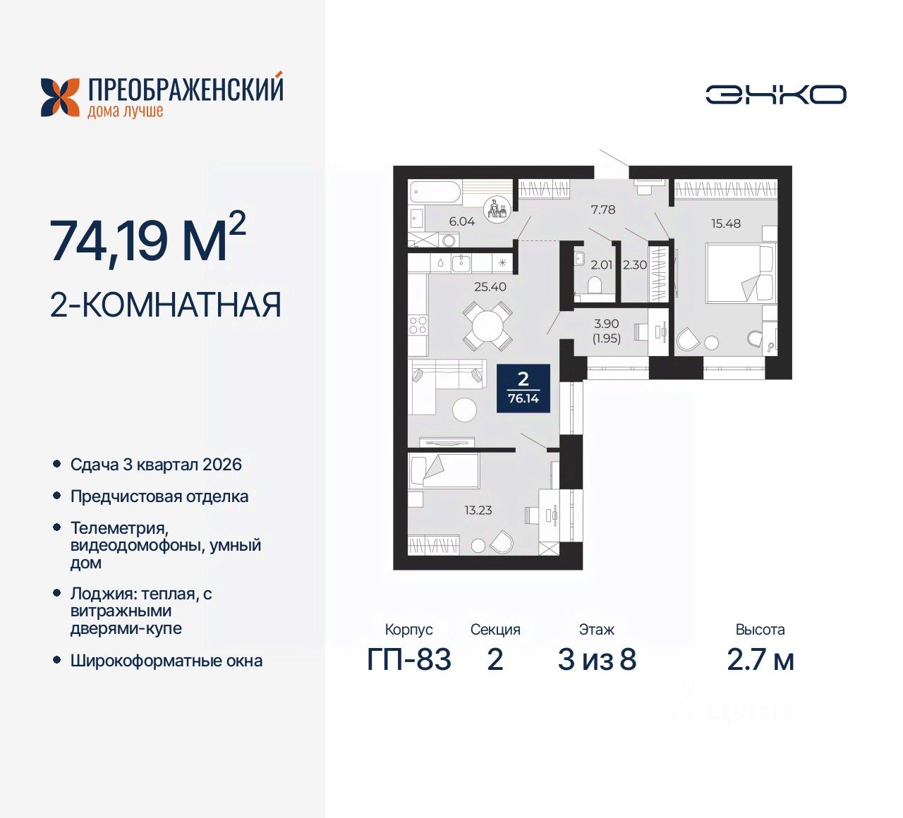 Продается двухкомнатная квартира с предчистовой отделкой в ЖК "Преображенский" на 3 этаже. Общая площадь: 74.19 кв.м., жилая: 28.71 кв.м., площадь просторной кухни-столовой: 25.4 кв.м. Квартира угловая, идеально подойдет любителям тишины и панорамных видов. В квартире одна лоджия, один раздельный санузел. Высота потолков 2.7 м.