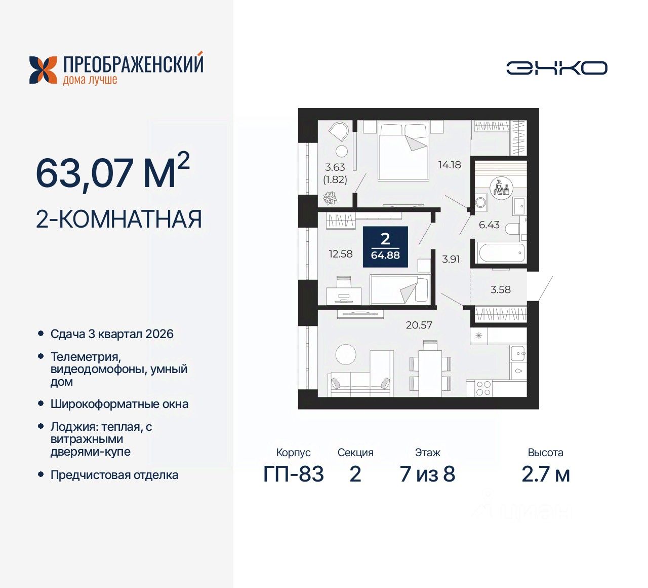 2-комн. квартира с предчистовой отделкой в ЖК "Преображенский" на 7 этаже. Общая площадь: 63.07 кв.м., жилая: 26.76 кв.м., площадь просторной кухни-столовой: 20.57 кв.м. Комнаты изолированные, все окна выходят на одну сторону. В квартире одна лоджия, один совмещенный санузел. Высота потолков 2.7 м.