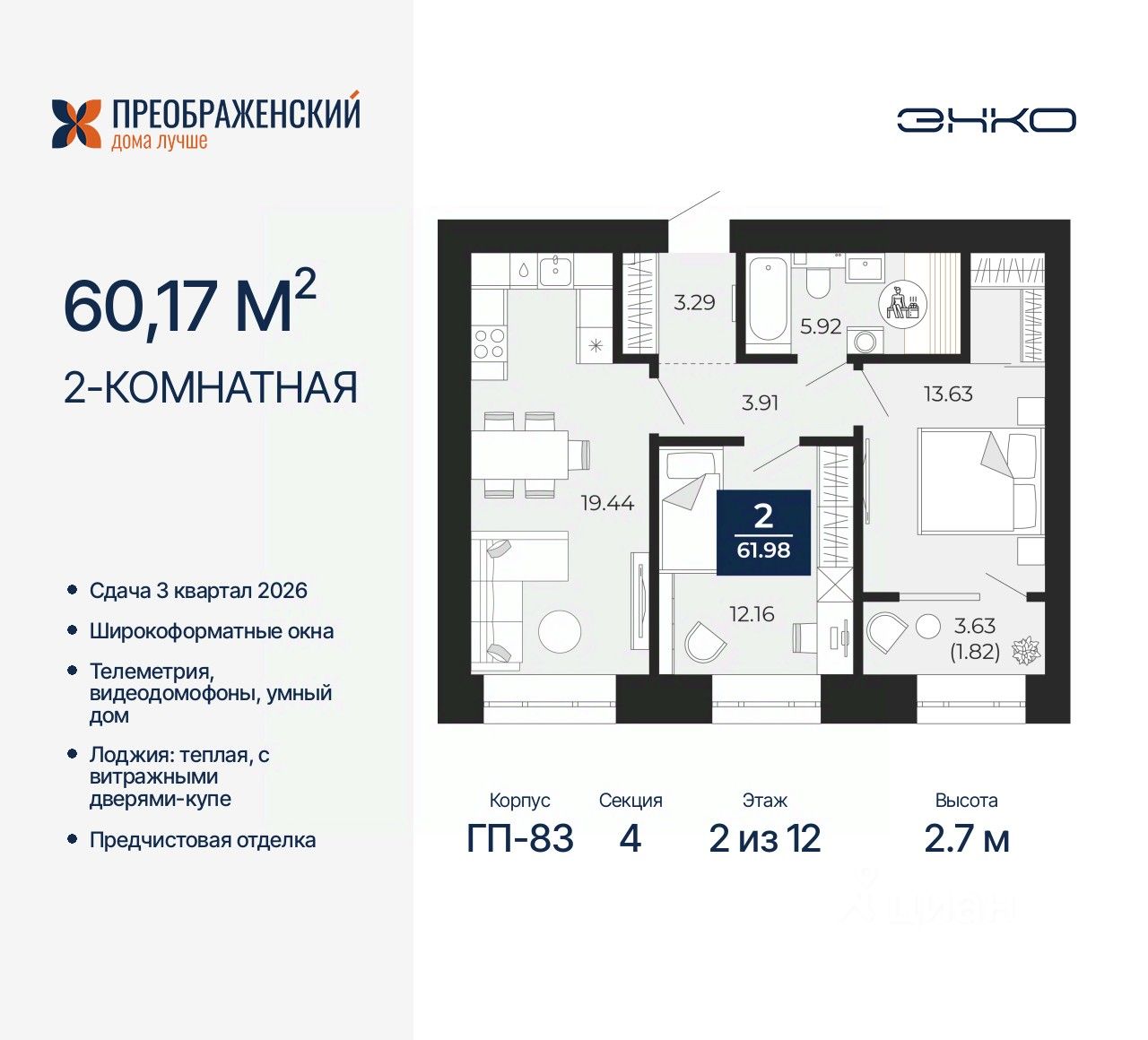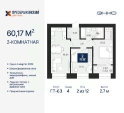 Продается 2-комн. квартира от застройщика с предчистовой отделкой в ЖК "Преображенский" на 2 этаже. Общая площадь: 60.17 кв.м., жилая: 25.79 кв.м., площадь просторной кухни-столовой: 19.44 кв.м. Комнаты изолированные, все окна выходят на одну сторону. В квартире одна лоджия, один совмещенный санузел. Высота потолков 2.7 м.