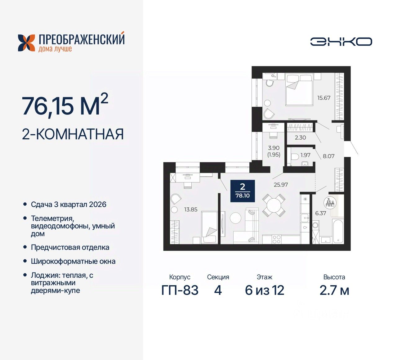 Продается двухкомнатная квартира с предчистовой отделкой в ЖК "Преображенский" на 6 этаже. Общая площадь: 76.15 кв.м., жилая: 29.52 кв.м., площадь просторной кухни-столовой: 25.97 кв.м. Угловая квартира, окна oбecпeчивaют paвнoмepнoe ocвeщeниe в тeчeниe дня. В квартире одна лоджия, один раздельный санузел. Высота потолков 2.7 м.