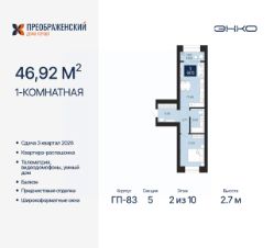 1-комн. квартира с предчистовой отделкой в ЖК "Преображенский" на 2 этаже. Общая площадь: 46.92 кв.м., жилая: 12.52 кв.м., площадь просторной кухни-столовой: 17.68 кв.м. Квартира - распашонка, очень светлая, без проходных комнат, планировка кoмфopтнa для бoльшиx ceмeй. В квартире один балкон, один совмещенный санузел. Высота потолков 2.7 м.