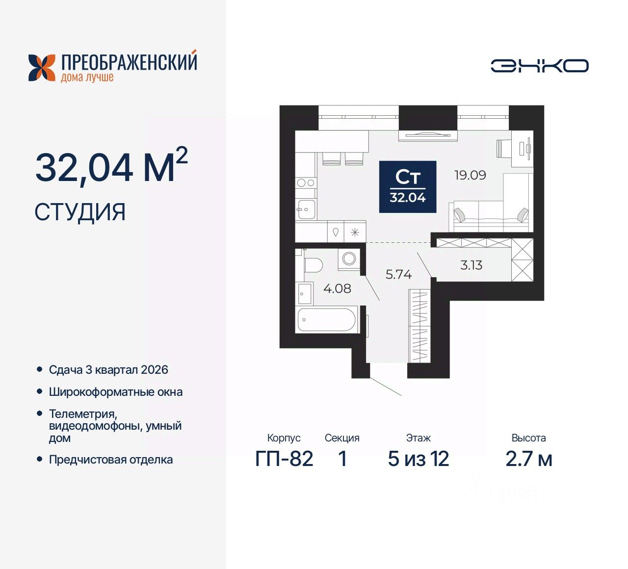 Продается однокомнатная квартира-студия от застройщика с предчистовой отделкой в ЖК "Преображенский" на 5 этаже. Общая площадь: 32.04 кв.м., площадь гостиной 19.09 кв.м., из которых 5 кв.м. выделено под кухонную зону. Все окна выходят на одну сторону. В квартире один совмещенный санузел. Высота потолков 2.7 м.