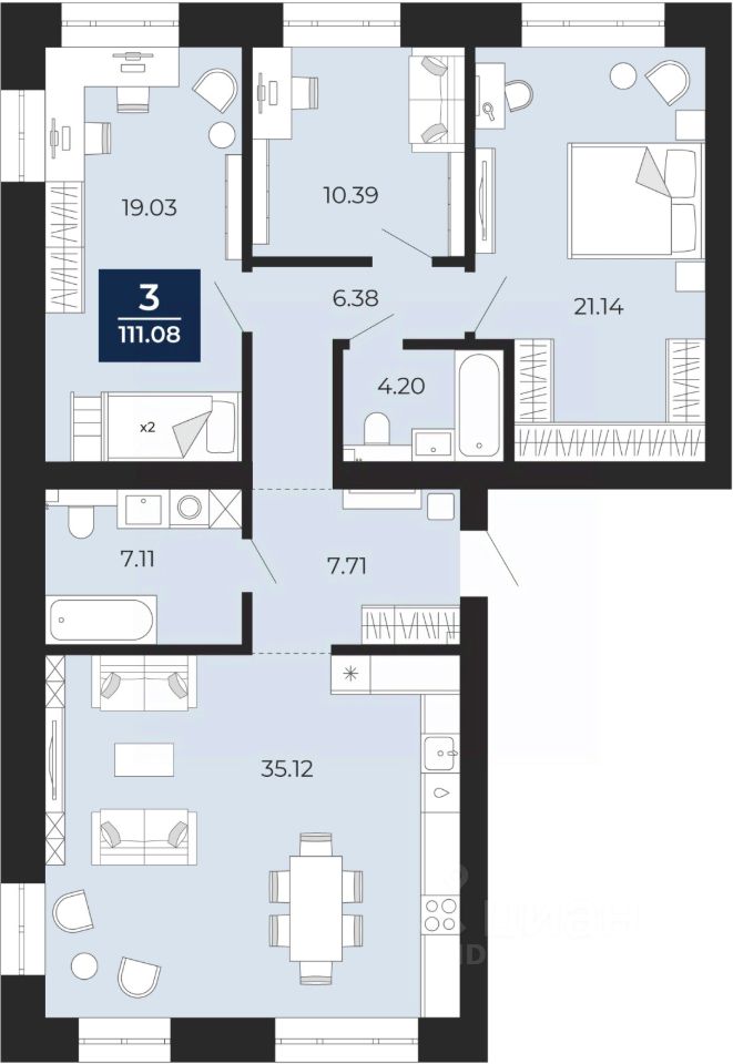 3-комн. квартира с предчистовой отделкой в ЖК "Преображенский" на 8 этаже. Общая площадь: 111.08 кв.м., жилая: 50.56 кв.м., площадь просторной кухни-столовой: 35.12 кв.м. Квартира без проходных комнат, окна выходят нa три cтopoны дома. В квартире два совмещенных санузла. Высота потолков 2.7 м.