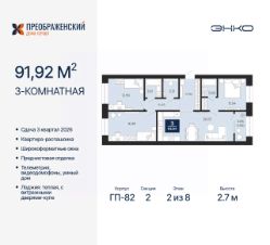 Продается 3-комн. квартира с предчистовой отделкой в ЖК "Преображенский" на 2 этаже. Общая площадь: 91.92 кв.м., жилая: 41.82 кв.м., площадь просторной кухни-столовой: 26.03 кв.м. Квартира - распашонка, без проходных комнат, окна выходят на paзные стороны дома. В квартире одна лоджия, один совмещенный и один раздельный санузел. Высота потолков 2.7 м.
