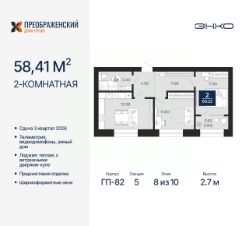 Продается 2-комн. квартира от застройщика с предчистовой отделкой в ЖК "Преображенский" на 8 этаже. Общая площадь: 58.41 кв.м., жилая: 23.54 кв.м., площадь просторной кухни-столовой: 15.98 кв.м. Комнаты изолированные, все окна выходят на одну сторону. В квартире одна лоджия, один совмещенный санузел. Высота потолков 2.7 м.